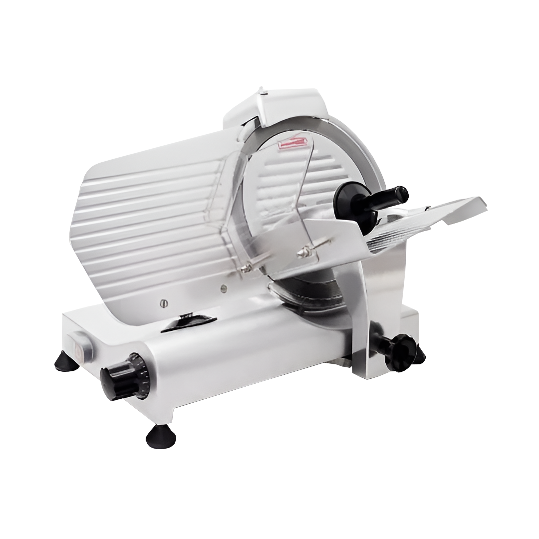 Rebanadora de carnes frías para delicatessen de acero inoxidable con cuchilla de 300 mm, afilador integrado, protector de navaja y transmisión de banda- Construcción de acero inoxidable